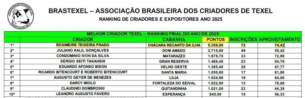 A Associação Paranaense de Criadores de Ovinos (Ovinopar) divulga, com satisfação, os resultados obtidos por seus associados no Ranking de Criadores do Ano de 2025, promovido pela Associação Brasileira de Criadores de Texel (Brastexel).